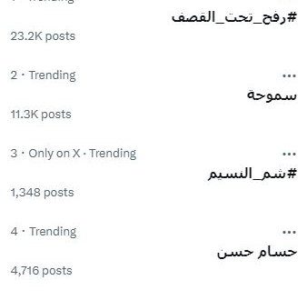 تصدر هاشتاج #رفح_تحت_القصف الأعلى في تريند منصة (اكس) تويتر سابقا ليسجل نحو 25 ألف تغريدة منذ صباح الاثنين، حيث انطلقت حرب الإبادة الجماعية، وألقت الطائرات الصهيونية