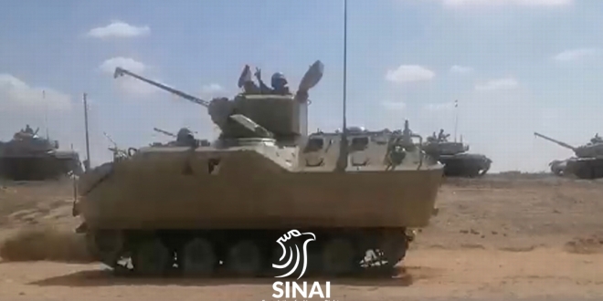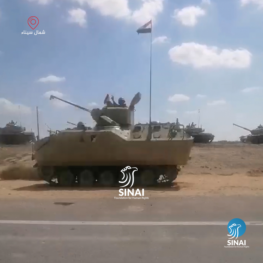 ونقلت المؤسسة عن شهود عيان من مدينة الشيخ زويد التي تبعد نحو 15 كيلومترا عن معبر رفح، أنهم رصدوا مرور نحو 15 ناقلة تحمل عربات مجنزرة ومدرعة منصوب عليها العدد القتالية، تتجه شرقا نحو الحدود عبر الطريق الدولي”.