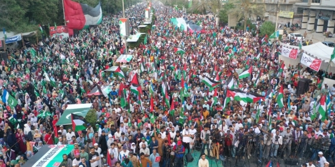 واحتشد آلاف الأشخاص في كراتشي، باكستان، للاحتجاج على مرور عام على غزو إسرائيل لقطاع غزة، مطالبين بوقف “الإبادة الجماعية” للفلسطينيين. وأحيت باكستان الاثنين، يوم التضامن مع فلسطين بمناسبة مرور عام على العدوان المستمر على غزة، والتي أسفرت عن مقتل أكثر من 41,800 فلسطيني.