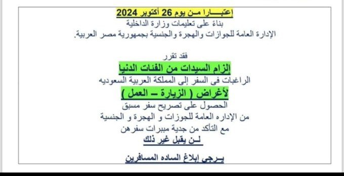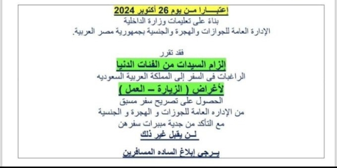 وكعادة حكومة الانقلاب في الإقلال من شأن المرأة وللمصريين في زمن سار فيه طبقتين في مصر الطبقة الأولى هم الأسياد والثانية هم العبيد في ظل الحكم القمعي والمستبد لقائد الانقلاب عبد الفتاح السيسي، بدأت المطارات تطبيق قرار الإدارة العامة للجوازات والهجرة والجنسية بوزارة الداخلية، والذي وصف بعض السيدات بالفئات الدنيا من الراغبات في السفر إلى المملكة العربية السعودية لأغراض الزيارة أو العمل بالحصول على تصريح مسبق من الإدارة، مع التأكد من جدية مبررات سفرهن.