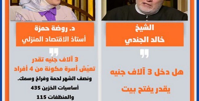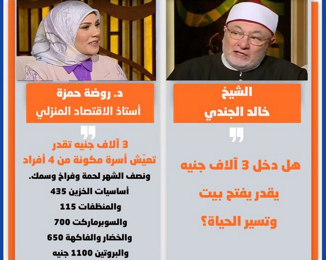 أثار قول أستاذ الاقتصاد المنزلي بجامعة حلوان روضة حمزة في البرنامج التلفزيوني لعلهم يفقهون “يمكن لأسرة من 4 أفراد أن تعيش بـ3 آلاف جنيه للأكل والشرب”، مضيفة “أنهم يستطيعون أن يأكلوا نصف الشهر لحمة وفراخ وسمك، والناس هتشهيص آخر شهيصة”.