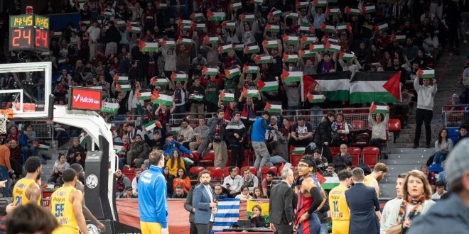 أعرب مشجعو برشلونة لكرة السلة عن تضامنهم مع الفلسطينيين خلال مباراة فريقهم في الدوري الأوروبي ضد نادي مكابي تل أبيب الإسرائيلي، حسبما ذكر موقع «جاستيزبيري» الإسباني.