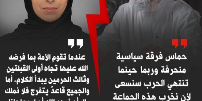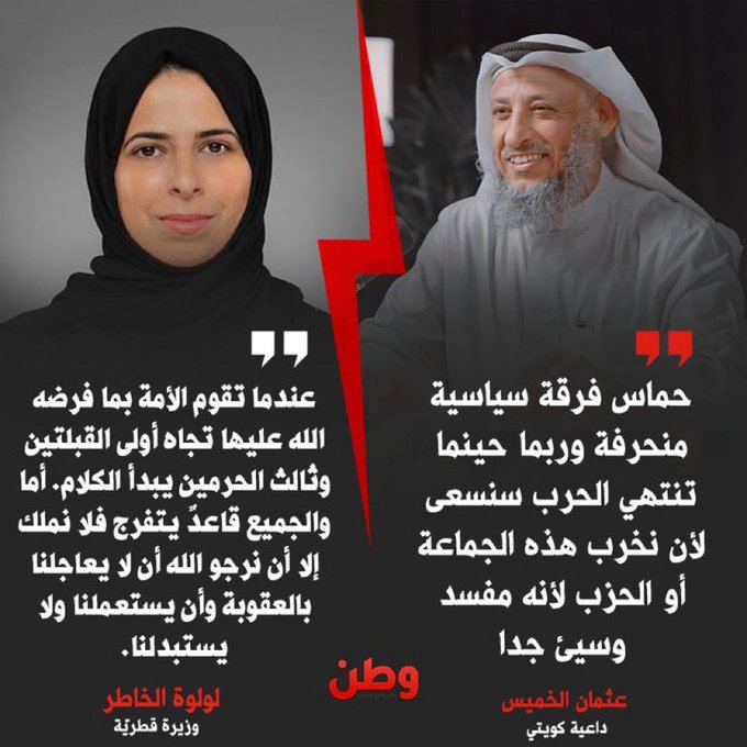 في السياق ذاته، قال النائب الكويتي السابق جمعان الحربش، إن “حماس ليست فرقة منحرفة، بل هي طليعة أهل السنة والجماعة، وهي الطائفة المنصورة التي بشر بها النبي ﷺ في بيت المقدس وأكناف بيت المقدس”.