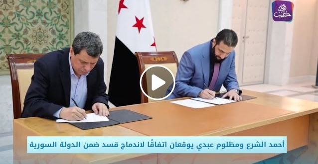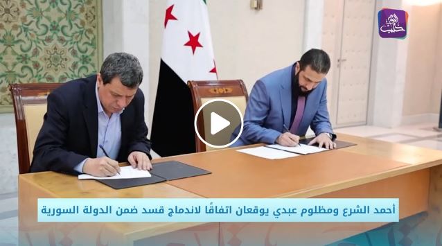 ووقع أحمد الشرع رئيس سوريا وقائد قوات سوريا الديموقراطية مظلوم عبدي اتفاق دمج قسد في مؤسسات الدولة، ونشرت الرئاسة السورية بيانا وقعه الطرفان وجاء فيه 8 بنود كما يأتي.