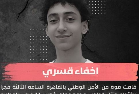 وأخفت سلطات الانقلاب الطفل محمد خالد جمعة عبدالعزيز، 15 عاما بعدما اقتحمت قوة أمنية تابعة للأمن الوطني ، مكونة من 10 أفراد بعضهم ملثمون ومسلحون، منزل جدة الطفل محمد في منطقة المطرية، وذلك في الحادية عشرة والنصف مساءً يوم 16 فبراير الماضي، دون إبراز أي إذن من النيابة.