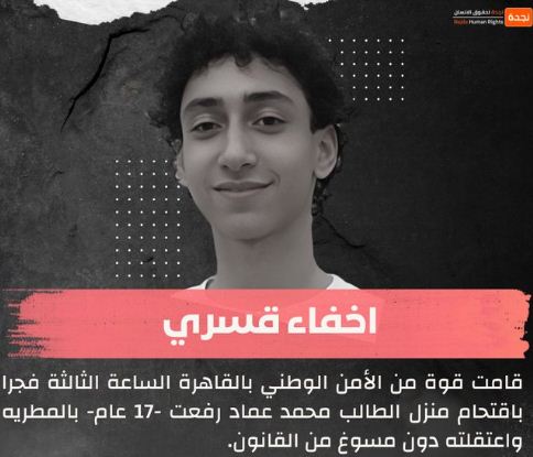 ومن حانب آخر قالت منزمة نجدة لحقوق الإنسان إنه في 20 نوفمبر 2024، قامت قوة من الأمن الوطني في القاهرة في الساعة الثالثة فجراً باقتحام منزل الطالب محمد عماد رفعت، البالغ من العمر 17 عاماً، في منطقة المطريه. حيث تم اعتقاله دون أي مسوغ قانوني، كما تم الاستيلاء على هاتفه المحمول واقتياده إلى جهة غير معلومة.