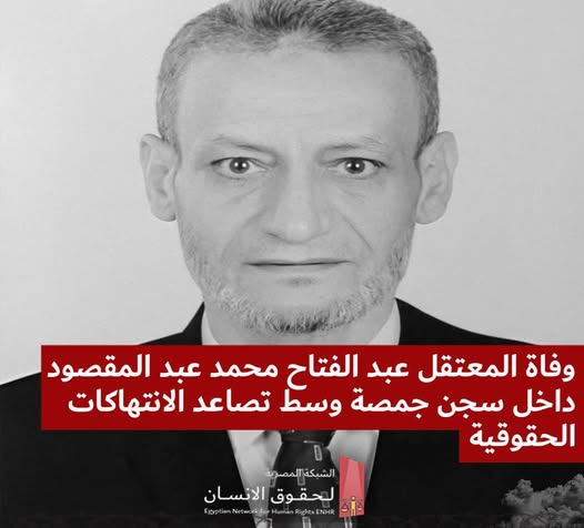 أعلنت الشبكة المصرية لحقوق الإنسان عن وفاة المعتقل عبد الفتاح محمد عبد المقصود عبيدو٬ داخل مستشفى المنصورة الجامعي بعد تدهور حالته الصحية خلال احتجازه بسجن جمصة شديد الحراسة تحت سلطة الانقلاب العسكرى.