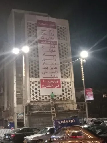 اللافتة المعلقة على واجهة مبنى المغتربات بسوهاج تضمنت: «نداء استغاثة، إحنا بنات مغتربات، محافظ سوهاج الانقلابي قطع عنا المياه والنور والغاز، عايز يهد المبنى علينا ويرمينا في الشارع».
