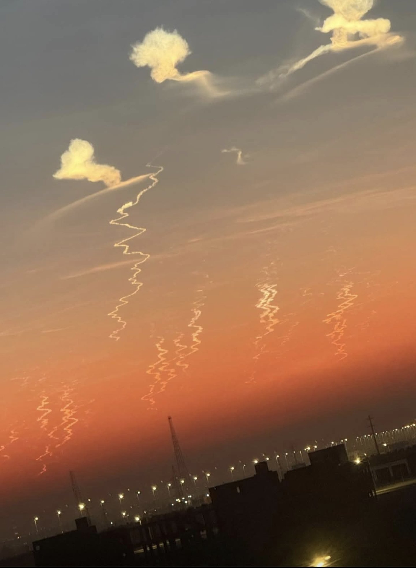 حساب محمود Mahmoud Allam فسر "الدخان المتعرج الغريب اللي ظهر في سماء مصر ؟! على أن " أقرب التفسيرات للصحة في الأغلب هي ان اللي انت شايفه قدامك ده هو عوادم وقود وآثار تكثف الهواء نتيجة اعتراض منظومات الدفاع الجوي لصواريخ ايران الباليستية فوق الصوتية خارج الغلاف الجوي للأرض.. ".
