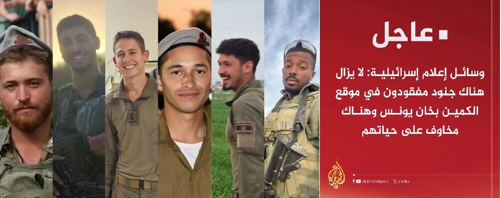 ونشرت  قناة الجزيرة @AJArabic "مع الحديث عن مقتل أكثر من 3 جنود وإصابة 17 على الأقل، ما ردود الفعل في الأوساط الإسرائيلية على ذلك ووجود مفقودين في موقع كمين خان يونس؟".