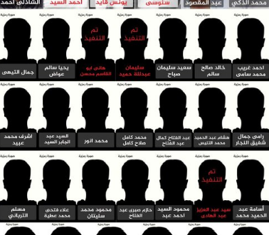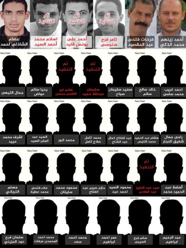 والمصريون الـ27 هم: عصام الشاذلي – فرحات فتحي (نُفذ فيه حكم الإعدام) – أحمد زينهم – أحمد غريب -خالد صالح – سعيد سليمان – يحيى سالم – جمال التيهي – رامي جمال – هشام عبد الحميد – عبد الفتاح كمال – محمد كامل – محمد أنور – السيد عبد الجابر السيد – أشرف محمد – أسامة عبد الحميد – محمود السيد – حازم صبري – محمود محمد (نُفذ فيه حكم الإعدام) – علاء فتحي – مسلم الترباني – عبد الرحيم إبراهيم – سالم فرج – عمر أحمد إبراهيم – محمد أحمد سعد – محمد أحمد المحمدي – سلمان فرج عود.