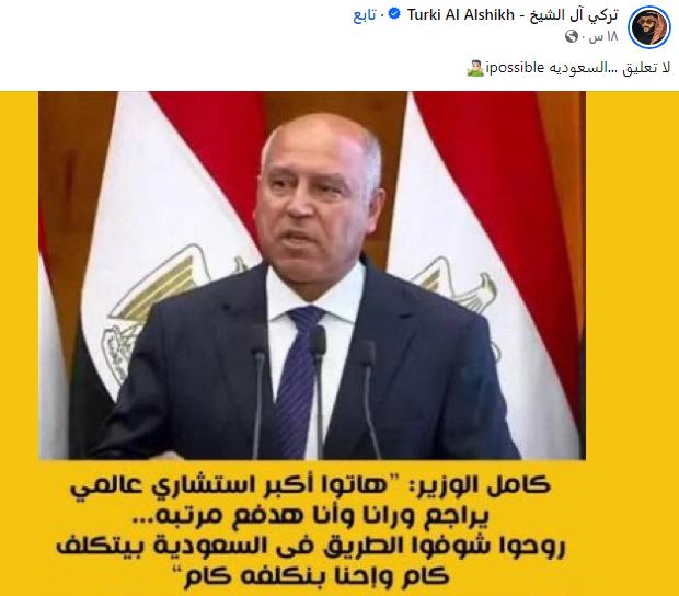 سخر تركي آل الشيخ ذراع الترفيه لولي العهد السعودي محمد بن سلمان من صبي السيسي نائب رئيس الحكومة ووزير النقل والصناعة و.. الوزير كامل الفريق بعد ان صرح "هاتوا أكبر استشاري يراجع ورانا وأنا هادفع مرتبه .. روحوا شوفوا الطريق في السعودية بيتكلف كام واحنا بنكلفه كام" فاستدعى الشيخ رئيس هيئة الترفيه السعودي الشهير "بطال عمره" حسب هتاف جماهير الأهلي المصري الشهير خطأ لغويا لكامل الوزير "ipossible" كدلالة على ضعفه الواضح علميا من ضعف لغته..