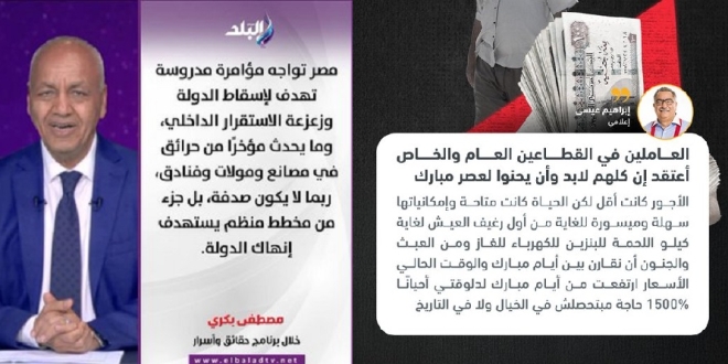 مصطفى بكري يحذر من مؤامرة إقليمية دولية لإزاحة السيسي في حين يخرج الملون إبراهيم عيسى بالقول: "من العبث أن نقارن بين أيام مبارك واليوم" ….. مقرا بفداحة الانهيار المعيشي خلال السنوات الأخيرة، وقال:" الأسعار قفزت بنسبة 1500%، والحياة باتت مستحيلة ..".