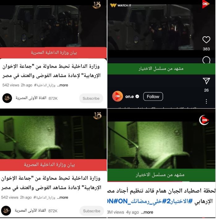وأشار إلى أنه مبدئيا، "مصداقية الداخلية مضروبة في مثل هذه البيانات، ولدينا تدقيق من إحدى منصات التدقيق المهمة كشف أن عدة لقطات في بيان الداخلية مأخوذة من مسلسل الاختيار(الرابط في التعليقات هتشوفوا كمان اللقطات المتطابقة في الصور)".