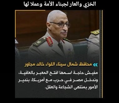 وسخر حسن الحسنات من تصريح مجاور قائلا: #حصحص_الحق #وظهرت_الحقيقة قال اللواء خالد مجاور محافظ شمال سيناء : – * ندير الأمور بمنتهى الشجاعة والعقل، لن نفتح معبر رفح بالعافية ونضيع مصر بإدخالها في حرب مع أمريكا"، مستدركا "في حين قال ال سي سي أنه لم يغلق معبر رفح دقيقة واحدة.. وقال نفس الكلام مدبولي رئيس الوزراء المصري أن مصر لم تغلق معبر رفح وانه مفتوح على طول.. من الصادق ومن الكاذب منهم. وحتى يعلم العرب من الخائن ومن يشارك بإبادة الشعب الفلsطيني.".