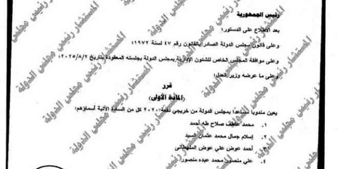في خطوة تكشف ملامح المشروع العائلي الذي يرعاه عبد الفتاح السيسي، أصدر المنقلب قراراً جمهورياً جديداً (رقم 447 لسنة 2025) يقضي بتعيين دفعة جديدة من المندوبين المساعدين بمجلس الدولة من خريجي دفعتي 2020 و2021، وسط فضيحة توريث واسعة لأبناء القضاة وكبار المسؤولين.
