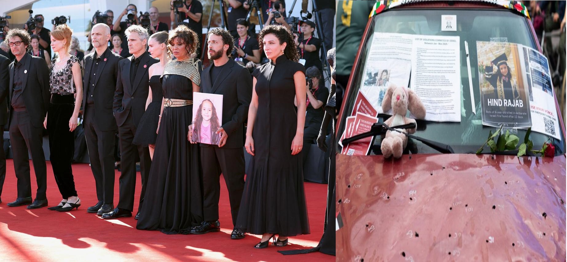 تابع عشرات الفنانين العالميين فيلم درامي بعنوان "صوت هند رجب" في مهرجان فينيسيا وهو فيلم يوثق الصرخات الأخيرة للطفلة الغزية قبل أن يقتلها قصف "إسرائيلي" كما ينافس الفيلم التونسي على "الأسد الذهبي" بدعم عالمي من براد بيت وخواكين فينيكس.