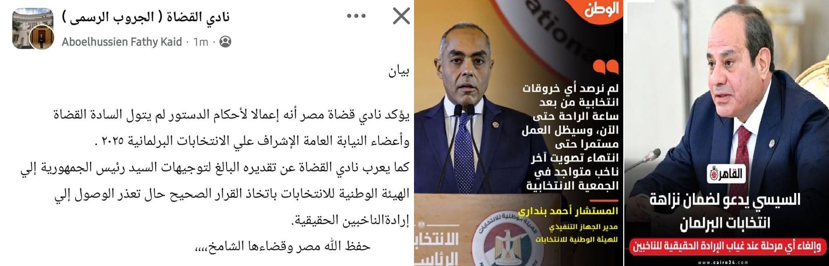 وكان بيان نادي القضاة في (18 نوفمبر 2025) أكد أن القضاة وأعضاء النيابة العامة لم يشرفوا على الانتخابات البرلمانية 2025، موضحا أن هذا الموقف يأتي التزامًا بالدستور الذي يقصر دور القضاة على ما يحدده القانون.