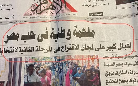 ونقلت منصة صحيح مصر @SaheehMasr أن “نتائج التصويت كشفت نسبة من منحوا أصواتهم لـ”القائمة الوطنية” لم تتجاوز 15.6% من إجمالي من يملكون حق التصويت، إذ بلغ عددهم 10.9 مليون مصوت من بين 69.9 مليون من لهم حق التصويت، وفي المقابل، بلغت نسبة الرافضين للتصويت لصالح القائمة نحو 11% من إجمالي المشاركين، أي ما يزيد على 1.3 مليون مصوت.