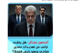 حمدين صباحي للشعب الفنزويلي: العرب واولهم المصريين مع فنزويلا وحريتها ثم اضاف .. انا عاوز صوتنا هنا يوصل من القاهرة إلى شوارع كاراكاس ليعلموا ان مصر معاهم.. وهتف الحضور يا ترامب يا جبان إوعى تكون نسيت فيتنام.. الجانب الآخر من المشهد: في فنزويلا نفسها، الجيش بارك تعيين نائبة مادورو التي حلفت القسم والإعلام يتحدث عن التطلع لحياة أفضل.. هل تتوقع أن يصل صوت السيد حمدين صباحي إلى المواطنين في كاراكاس ؟ او يؤثر على قرار المحكمة يوم 17 في محاكمة مادورو ؟