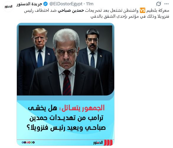 وعبر @ElDostorEgypt قالت صحيفة الدستور "معركة بلطيم 🆚 واشنطن تشتعل بعد تصريحات حمدين صباحي ضد اختطاف رئيس فنزويلا وذلك في مؤتمر بإحدى الشقق بالدقي".