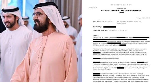 وأضاف "تصف الضحية كيف نُقلت جواً إلى دبي للقاء محمد بن راشد آل مكتوم، رئيس وزراء الإمارات الحالي، حيث قُيدت من رقبتها إلى جدار إسمنتي في الخارج.