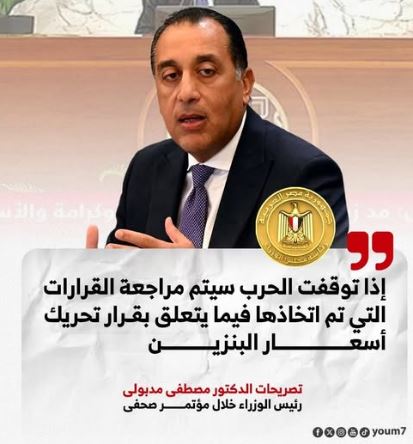 بعد زيادة أسعار البنزين والسولار والغاز والبوتاجاز، قال رئيس حكومة السيسي (8 سنوات في منصبه): إن "الزيادة الأخيرة في أسعار البنزين والسولار والغاز جاءت نتيجة قفزات غير مسبوقة في أسعار الطاقة عالميًا، وأن القرارات الحالية استثنائية فرضتها الظروف الدولية والحرب الدائرة في المنطقة".