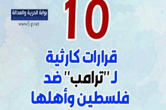 لا يتوقف الرئيس الأمريكي “دونالد ترامب” عن إيذاء العرب والمسلمين بالتخطيط والقول والفعل؛ دعمًا للصهاينة وتحقيقًا لمصالح دولة الكيان الصهيوني. في الإنفوجراف التالي نستعرض أبرز 10 قرارات أصدرها ...