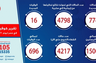 أعلنت وزارة الصحة والسكان بحكومة الانقلاب، اليوم الخميس، عن تسجيل 774 حالة جديدة ثبتت إيجابية تحاليلها معمليًا للفيروس، ووفاة 16 حالة جديدة. وقال الدكتور خالد مجاهد، المتحدث الرسمي ...