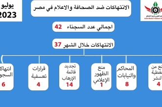 37 انتهاكا لحرية الإعلام واستمرار حبس 42 صحفيا خلال يوليو الماضي