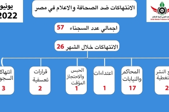 وثق المرصد العربي لحرية الإعلام 26 انتهاكا متنوعا  في تقريره عن انتهاكات حرية الإعلام في مصر خلال يونيو 2022 واستمرار حبس 57 صحفيا وصحفية مع نهاية يونيوالمنقضي ، بما يعكس تواصل ...