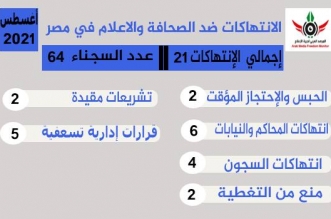 رصد تقرير انتهاكات حرية الصحافة في مصر لشهر أغسطس المنقضي الصادر عن المرصد العربي لحرية الإعلام  21 انتهاكا متنوعا. وجاء في المرتبة الأولى من حيث العدد، انتهاكات المحاكم والنيابات بـ(6) ...