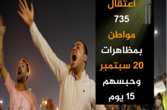 رصد فريق دفاع الحقوقي والقانوني أسماء 735 مواطنا تم اعتقالهم على مدار 10 أيام منذ 20 سبتمبر وحتى 30 سبتمبر المنقضى على خلفية المظاهرات التى خرجت تطالب برحيل ...