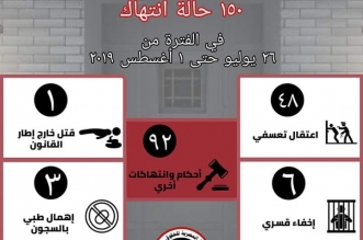 رصدت "التنسيقية المصرية للحقوق والحريات"، خلال الأسبوع الماضي منذ يوم 26 يوليو حتى 1 أغسطس 2019، 150 حالة انتهاك لحقوق الإنسان في مصر، تنوعت بين 48 حالة اعتقال تعسفي، ...