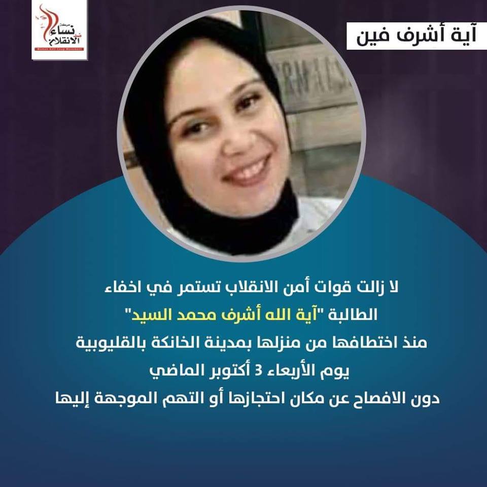 استنكرت حركة نساء ضد الانقلاب استمرار الإخفاء القسري لكل من الطالبة “ندا عادل محمد” ابنة مدينة القرين في الشرقية، و”آية أشرف محمد السيد” ابنة مدينة الخانكة بالقليوبية، دون ...