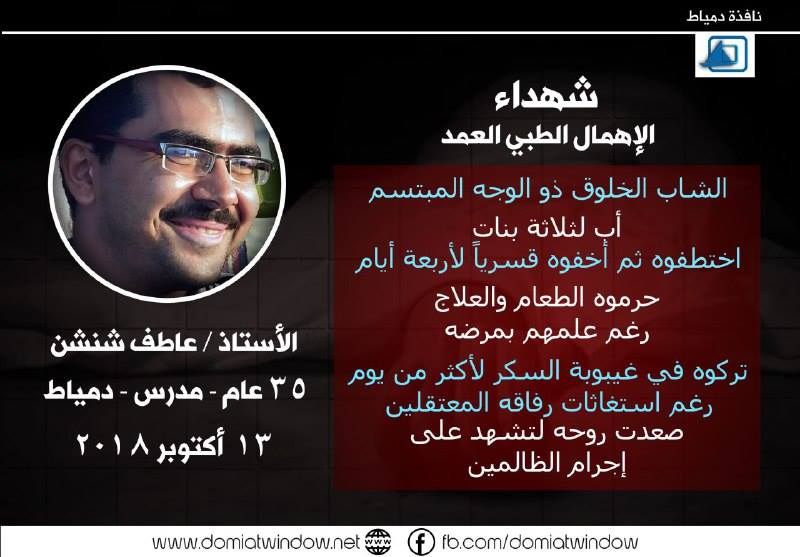 تداول رواد مواقع التواصل الاجتماعي ما كتبته زوجة الشهيد عاطف شنشن، الذي فاضت روحه مؤخرًا بعد اعتقاله وإخفائه قسريًا لمدة 4 أيام داخل مركز شرطة دمياط، حيث حرموه ...