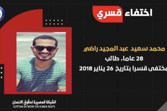 رصدت الشبكة المصرية لحقوق الإنسان استمرار اختفاء طالب الجامعة العمالية قسريا ، محمد سعيد بدوي عبد المجيد راضي، 29 عاما، والمقيم بالخانكة بمحافظة القليوبية، بعد التحفظ عليه للعام ...