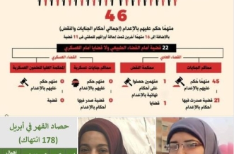 أحكام بإعدام 46 مواطنا و178 انتهاكا في إبريل المنقضي والحرية لـ23 سيدة و5 أطفال