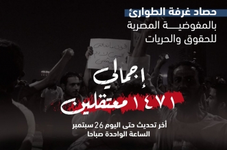 وثَّقت غرفة طوارئ المفوضية المصرية للحقوق والحريات، 1471 معتقلا (بينهم 37 متظاهرا رفضت أسرهم النشر عنهم)، منذ خروج مظاهرات 20 سبتمبر الجاري وحتى الساعات الأولى من صباح اليوم ...