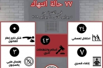 كشفت "التنسيقية المصرية للحقوق والحريات" عن ارتكاب ميليشيات أمن الانقلاب 77 جريمة وانتهاكا لحقوق الإنسان خلال الأسبوع الماضي، تنوعت ما بين الاعتقال والإخفاء القسري والإهمال الطبي والمحاكمات الهزلية. ...
