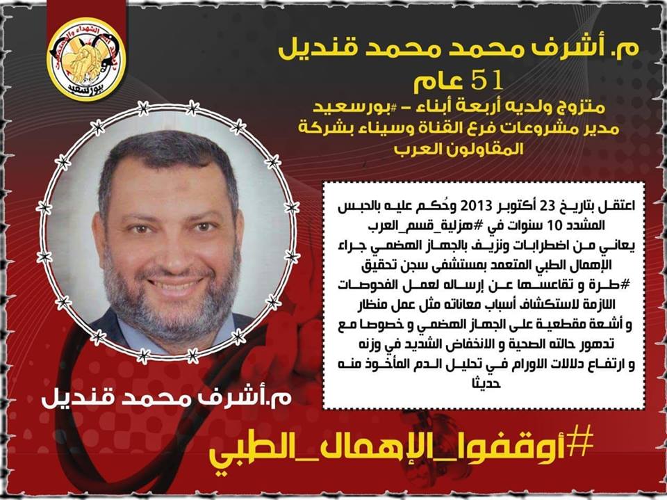 تفاقمت الحالة الصحية للمعتقل المهندس أشرف قنديل بشكل بالغ السوء، بما يخشى على حياته نتيجة لما يتعرض له من إهمال طبي داخل محبسه في سجن تحقيق طره. وجددت ...