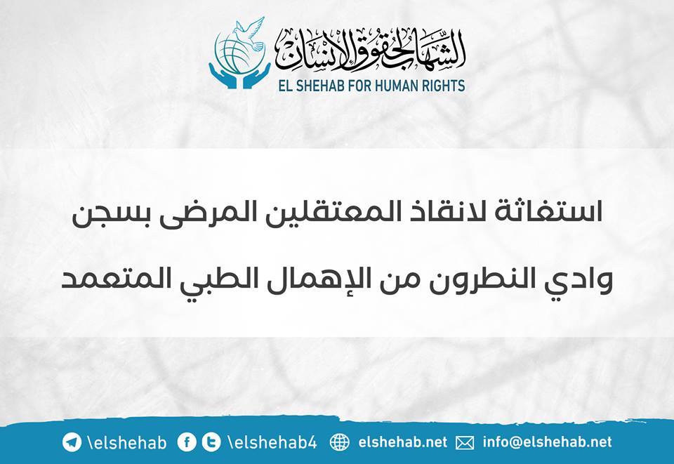 وجّه أهالي 14 معتقلًا بسجن وادى النطرون، 440 نداء استغاثة لإنقاذ ذويهم المعتقلين المرضى بسجن وادي النطرون من الإهمال الطبي المتعمّد الذي يُمارس بحقهم، بما يمثل جريمة قتل ...
