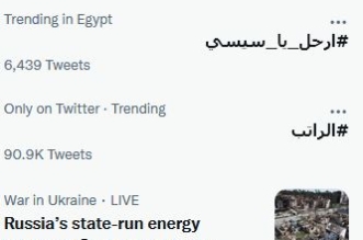 تصدر هاشتاج #ارحل_يا_سيسي موقع "تويتر" لليوم الثاني على التوالي، مكررا تصدره ربما لعشرات المرات السابقة خلال السنوات الأخيرة من حكم العسكر، وكانت هذه المرة لافتة بعد أن جاءت ...