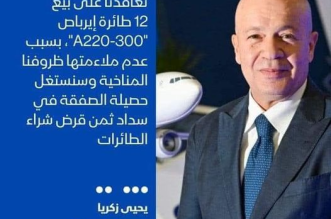 تصدر هاشتاج #مصر_للطيران بعد تصريح رئيس مجلس إدارة الشركة القابضة لمصر للطيران، يحيى زكريا: “تعاقدنا على بيع 12 طائرة إيرباص “A220-300″، بسبب عدم ملاءمتها ظروفنا المناخية، وسنستغل حصيلة ...